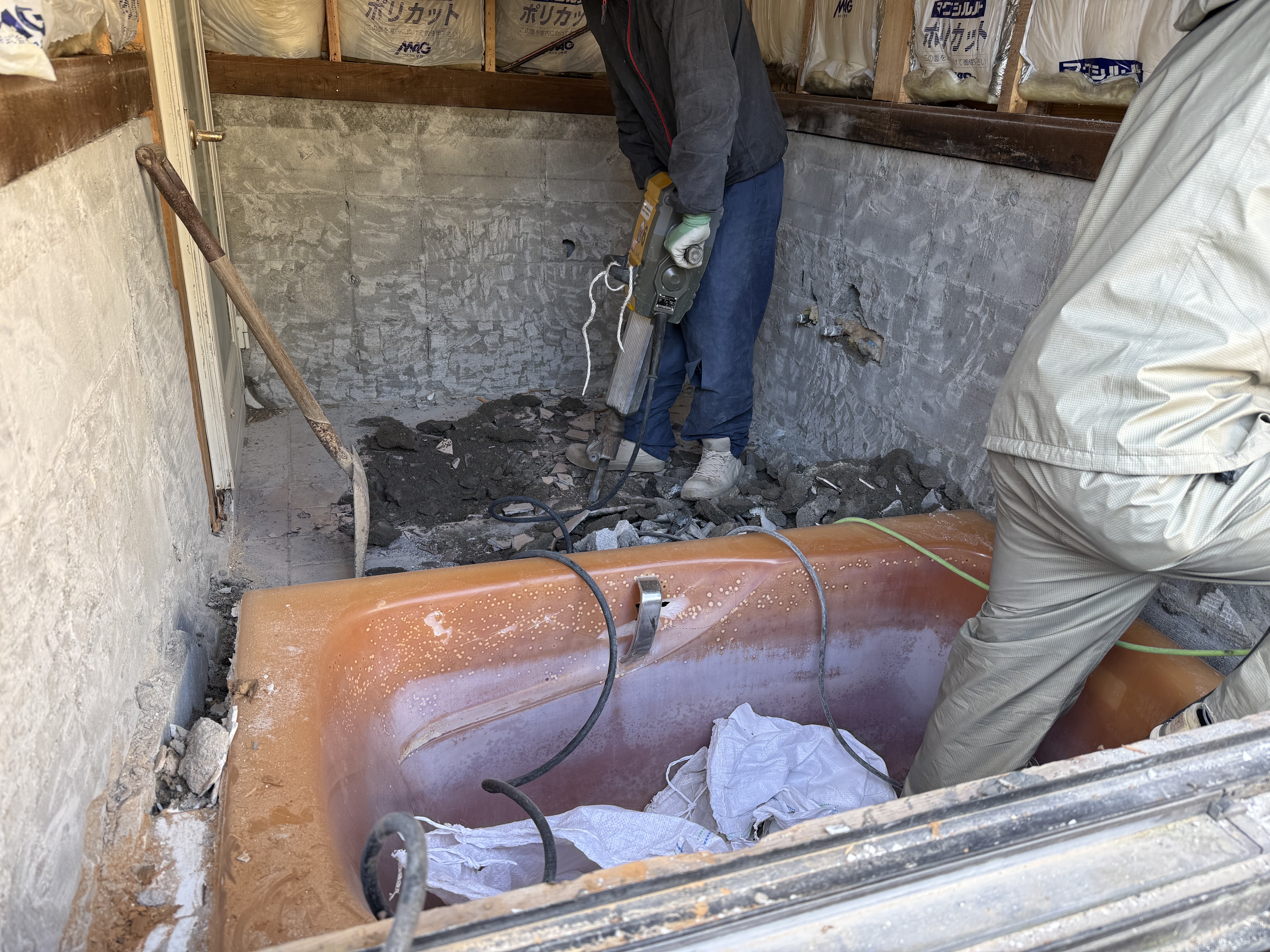 タイルを剥がし、土台や基礎が剥き出しになった状態を自分たちの目で確かめます。👀